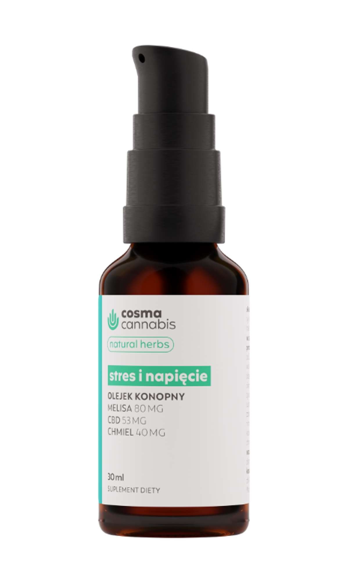 Cosma Cannabis Stres i napięcie CBD+melisa+chmiel olejek to suplement diety w postaci płynu, wspierający funkcjonowanie organizmu człowieka. W w swoim składzie zawiera olejek z melisy, chmielu oraz konopi (z CBD). Preparat obniża uczucie stresu i napięcia oraz przywraca równowagę organizmu. Nie zawiera THC.